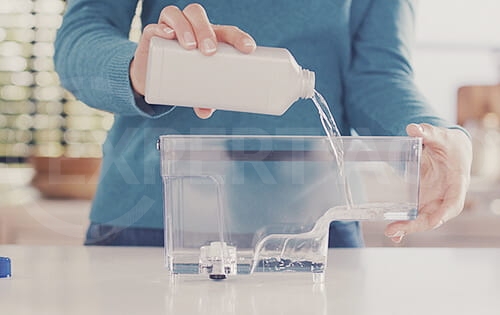 - Wlej cały roztwór do usuwania kamienia Philips do zbiornika wody, a następnie napełnij zbiornik czystą wodą.